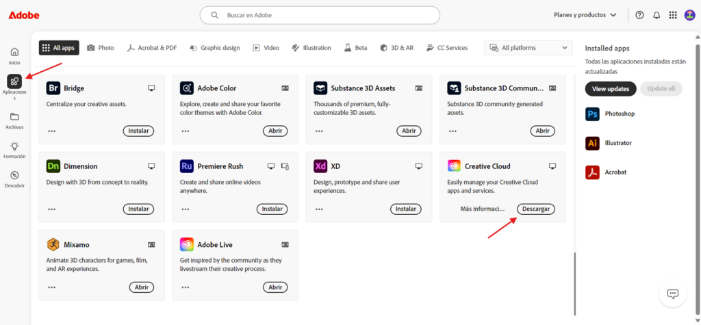 - Descargar Adobe Creative Cloud: Dirigirse a la opción «Aplicaciones», que se encuentra en la barra lateral izquierda y buscamos la aplicación «Cretive Cloud»