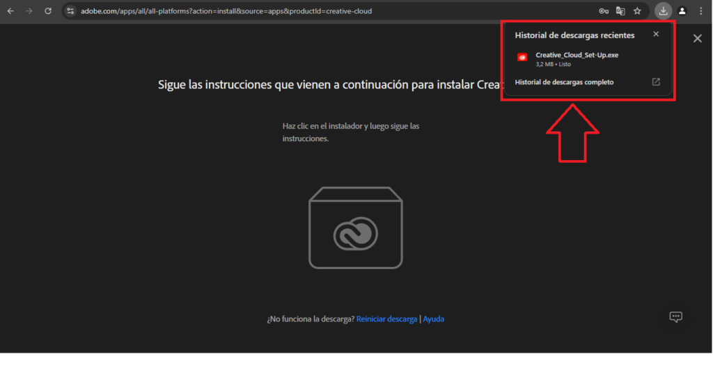 - Ejecuta el archivo descargado: Una vez que el archivo de instalación se haya descargado en tu equipo, ejecútalo. Se abrirá el asistente de instalación de Adobe Creative Cloud.