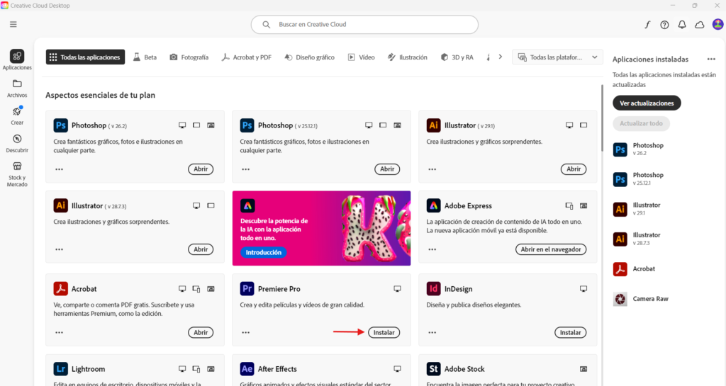 - Instalar las aplicaciones de Adobe: Dentro de la interfaz de Creative Cloud, verás una lista de todas las aplicaciones disponibles, como Photoshop, Illustrator, Premiere Pro, etc. Selecciona la aplicación que deseas instalar y haz clic en el botón «Instalar» junto a la aplicación seleccionada, el proceso de instalación comenzará.